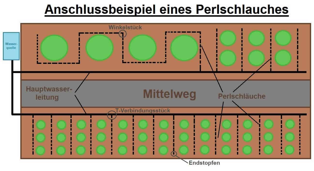 Bei der oberirdischen Verlegung des Perlschlauches ist man wesentlich schneller fertig. Hier muss man nur den Schlauch entsprechend verlegen und eventuell zurechtschneiden und mit Winkelstücken ans Beet anpassen. Wenn Sie den Perlschlauch verlegen, achten Sie darauf, dass auch später alle Pflanzen gleichmäßig bewässert werden und nicht eine Pflanze am Rand zu wenig Wasser abbekommt. Abseits stehen Pflanzen kann man zur Not mit einem Y-Adapter erreichen und so den Perlschlauch etwas verzweigen. Damit Sie sehen, welche Möglichkeiten es gibt, haben wir einmal zwei Skizzen angefertigt, in denen man gut sehen kann, wie man einen Perlschlauch verlegen kann.